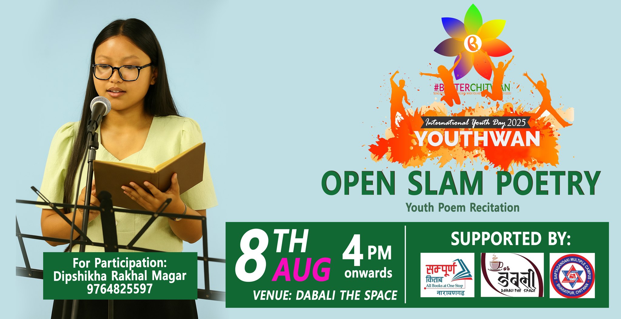 Better Chitwan’s Youthwan 2025 is organizing a Open Poetry Session to Celebrate the Literature, creativity and Art together by bringing all the amazing poems in the field. In this event you can be the inspiration to many by participating and presenting your poems.
