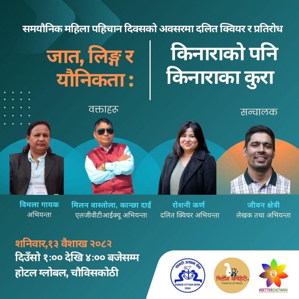 समायौनिक महिला पहिचान दिवसको अवसरमा दलित क्वियर र प्रतिरोध स्वरूप आयोजित यस प्यानल छलफलमा यहाँहरु सम्पूर्णलाई हार्दिक स्वागत गर्दछौ । साथै वैशाख १३ गतेबाट चौबिस्कोठी चोकमा चित्रकला प्रदर्शनी पनि सञ्चालन […]